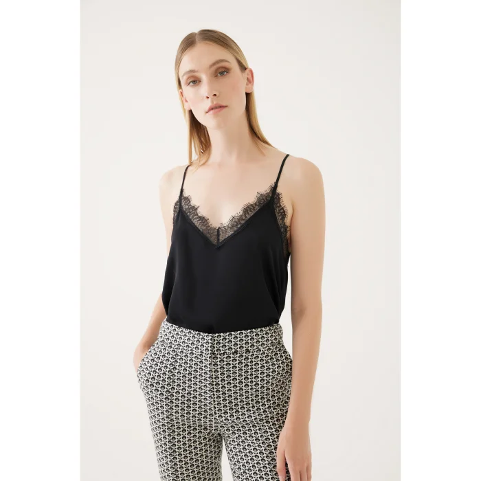 The strappy blouse model made of viscose fabric creates an elegant style. With its V-neck and lace edges, it highlights female charm. It fits perfectly with blazers, chiffon skirts and jeans. It can be complemented by pieces such as heels and sandals.