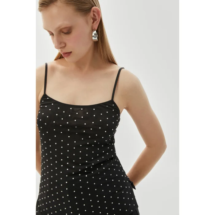 Offering elegance and comfort together, the Hanging Stone Detailed Lycra Knitted Blouse gives a sparkling look with its stone details. Its lycra fabric provides a perfect fit and freedom of movement, while its strappy design offers a spacious option in summer. This blouse is ideal for special occasions and stylish events.
