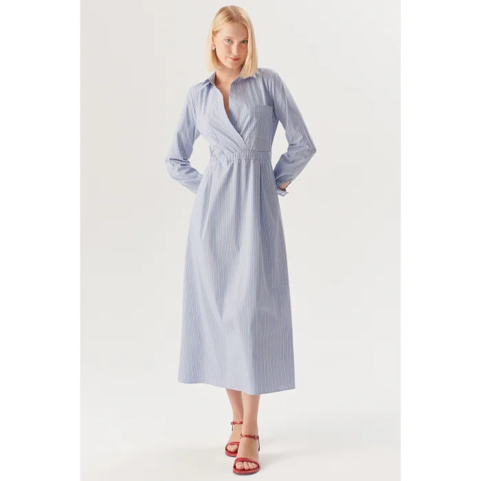 The striped midi dress with elasticated waist, where timeless lines and modern cuts meet, offers elegance and comfort together from day to night. While it provides comfort all day long with its light and breathable fabric, its elastic waist detail adapts to the body and creates an elegant silhouette. The classic shirt collar offers a sharp yet feminine stance, while the pinstripe patterns add an air of sophistication to the dress. Its long-sleeved design offers an ideal use in both seasonal transitions and layered combinations. You can achieve a comfortable style by combining it with sneakers or sandals during the day, and you can get a classic elegance with heels and minimal accessories in the evening.