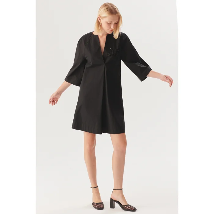 Offering a timeless and sophisticated style, the black mini dress with embroidery details makes a strong statement with its minimal design. The slightly widened regular cut provides comfort, while the embroidery detail on the chest adds an elegant touch to the dress. You can pair it with flat sandals to add a simple yet impressive atmosphere to your daily style, or complement it with evening chic heels and elegant accessories. Shaped by Exquise's original design approach, this dress creates a stylish and powerful style that adapts to every moment of city life.