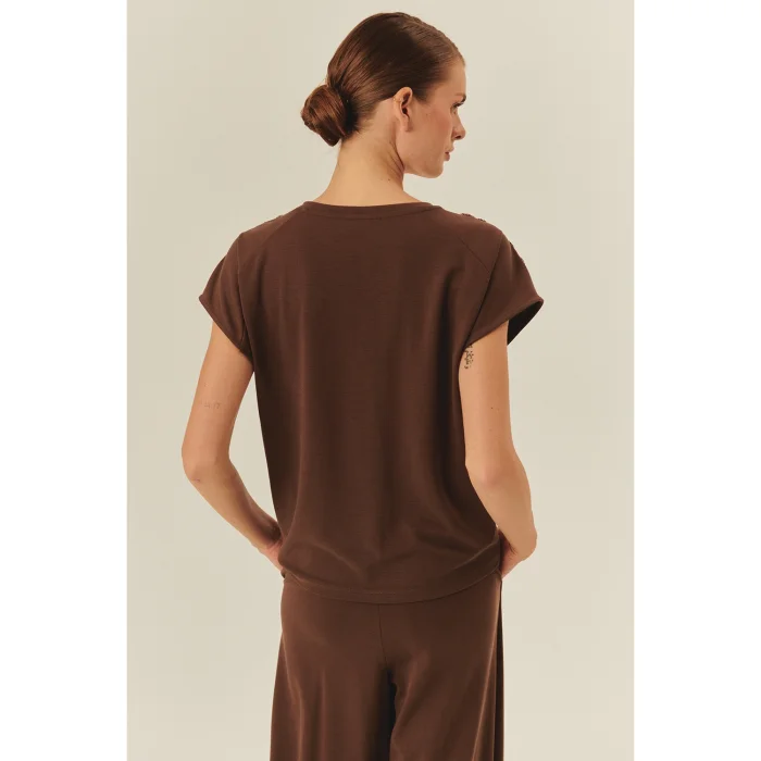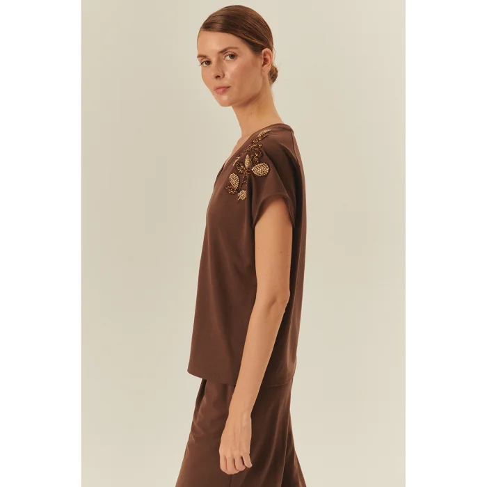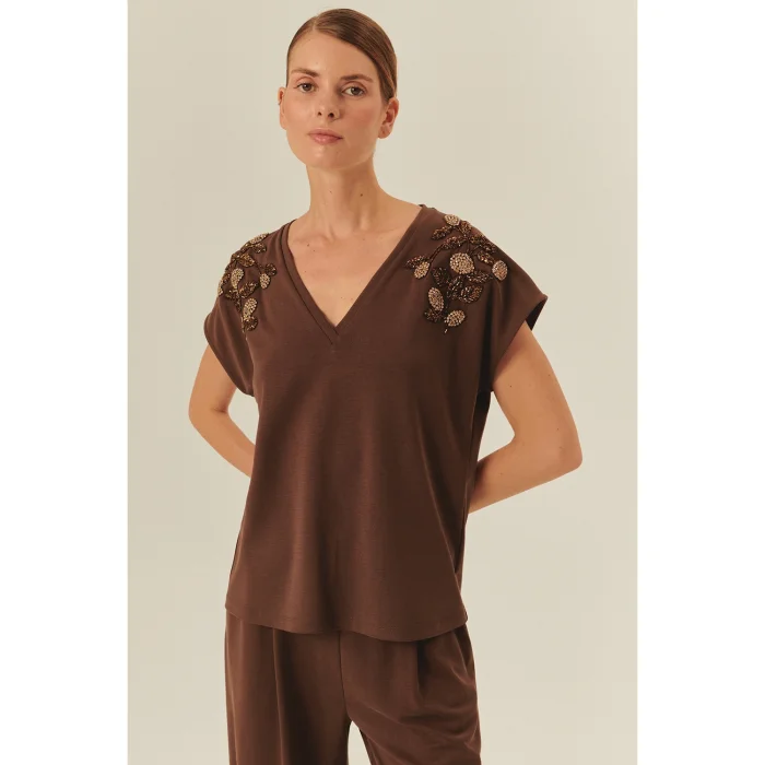This stylish and elegant brown t-shirt draws attention with its handcrafted details on the shoulder area. While it adds a feminine atmosphere with its V-neck cut, the embroidery on the shoulders gives the t-shirt a luxurious look. Offering a wide range of uses from daily combinations to special invitations, this model adds a sophisticated touch to your style.