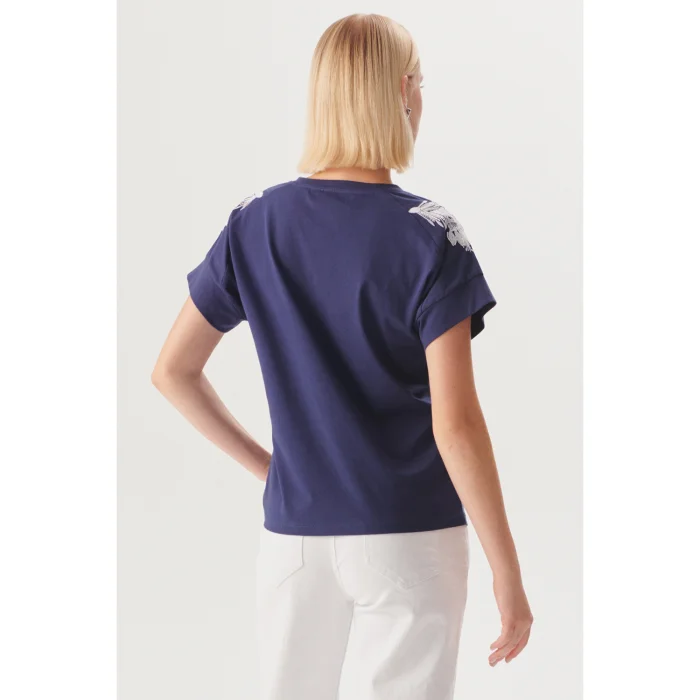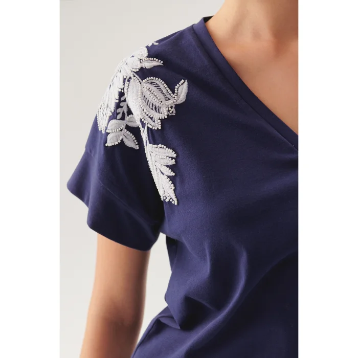 Offering elegance and comfort together, this V-neck navy blue cotton t-shirt draws attention with its elegant embroidery details. The floral motif embroidery on the shoulder adds a sophisticated atmosphere to the t-shirt and offers a comfortable use thanks to its regular fit cut. It is an ideal choice to add an elegant touch to your daily combinations.