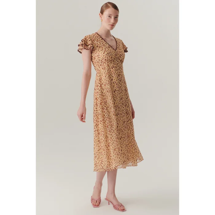 This midi-length dress, which gains movement with elegant patterns, creates a modern and feminine silhouette with its deep V-neck cut and sleeve details. Its chiffon-textured fabric offers a light and fluid stance, while its regular fit provides a balanced fit for every body. Thanks to its vibrant color transitions, it is a choice that effortlessly carries elegance from the office to evening meetings.