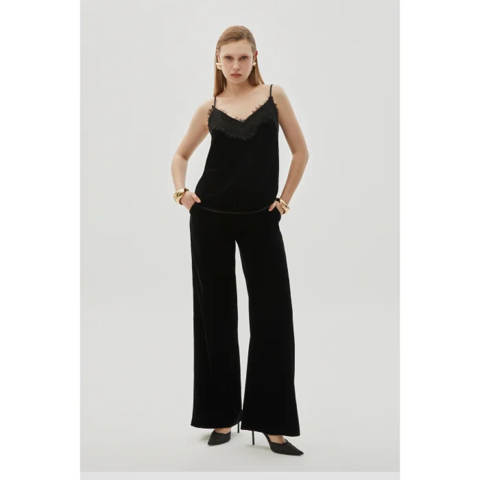 Reflecting elegance with its velvet texture, this V-neck blouse adds an air of sophistication with its lace details. Thanks to its regular fit cut, it offers both elegance and comfort together, making it an ideal option for your daily or special occasion combinations. It will take its place in your closet as one of the elegant touches of the 24 Fall/Winter collection.
