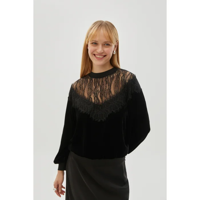 This black blouse, which draws attention with the harmony of velvet and tulle, adds a modern touch to elegance. While it fits comfortably on the body with its regular fit cut, it is a piece that will make a difference in any environment with its special details. Style your wardrobe as one of the sophisticated selections from the 24 Fall/Winter collection.