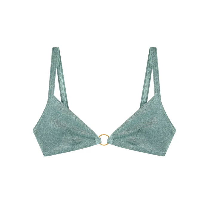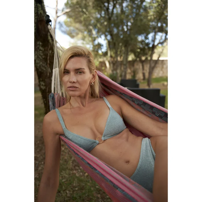 Discover the enchanting Amelia Bralette from our Sparkle Collection. Its baby blue hue, adorned with glitter and a gold color circle accessory, transforms any outfit into a statement piece. Perfectly versatile, it's designed for innerwear elegance and sunbathing chic, making it an indispensable part of your wardrobe whether you're lounging on the beach or stepping out for a night