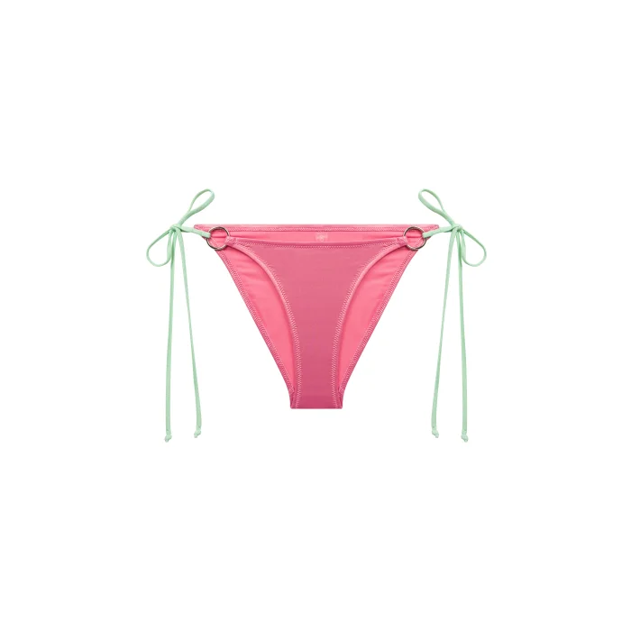 Echoing the top's vibrant theme, these bikini bottoms come in a glossy pink with contrasting green ties that can be adjusted for the perfect fit. The gold circle accents echo the top's detailing, adding a touch of sophistication to the playful design.