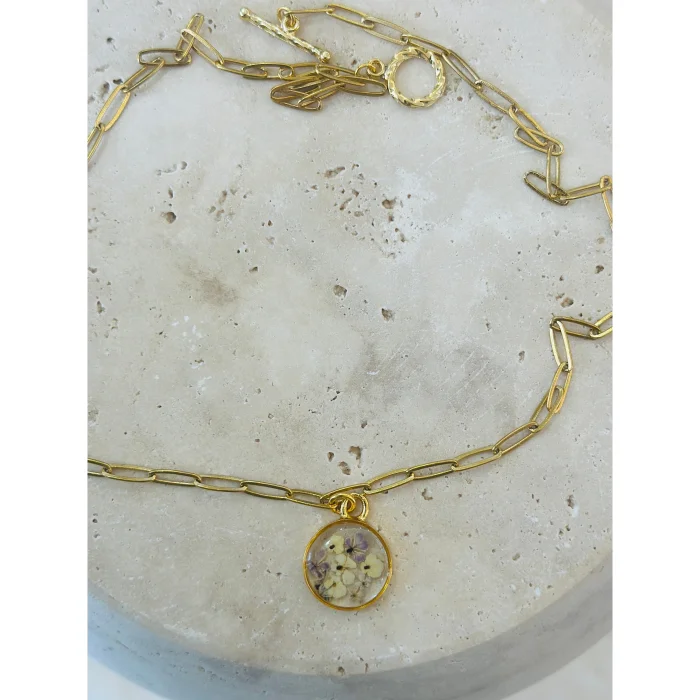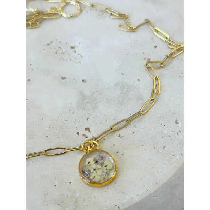 The way the tiny flowers are arranged is unique and no part will be the same as the other, the product will be exclusive only to its owner.The metal parts of the product and the chain are 14 karat gold plated.