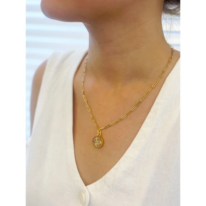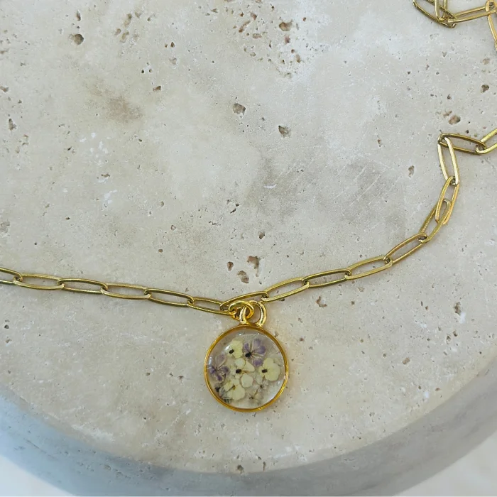 Each piece is filled with particles of Queen Anne's Lace flower, which are collected one by one by hand and then carefully plucked from the stem and pressed and dried.After the drying stage, these particles are carefully placed in handmade gold-plated frames and brought together with jewelry-grade crystal resin.