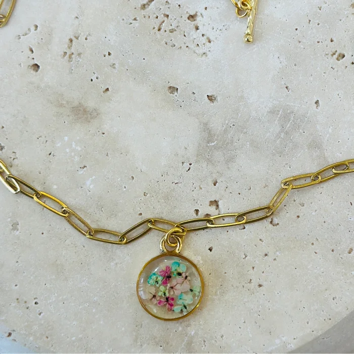 The way the tiny flowers are arranged is unique and no part will be the same as the other, the product will be exclusive only to its owner.The metal parts of the product and the chain are 14 karat gold plated.