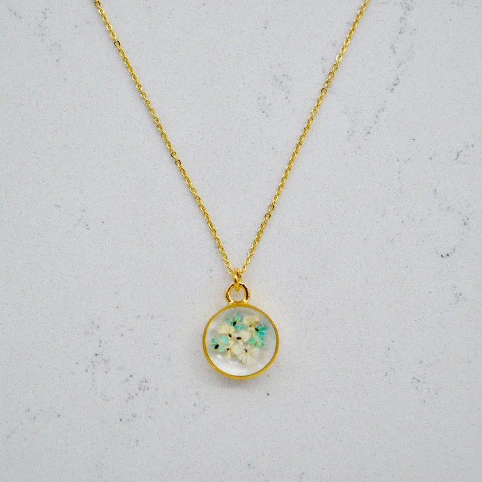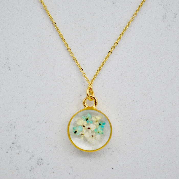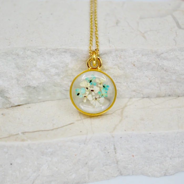 Each piece is filled with particles of Queen Anne's Lace flower, which are collected one by one by hand and then carefully plucked from the stem and pressed and dried.After the drying stage, these particles are carefully placed in handmade gold-plated frames and brought together with jewelry-grade crystal resin.