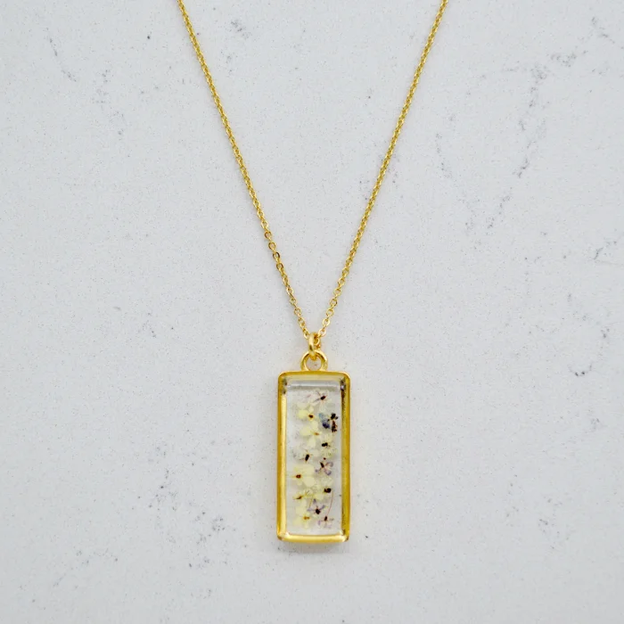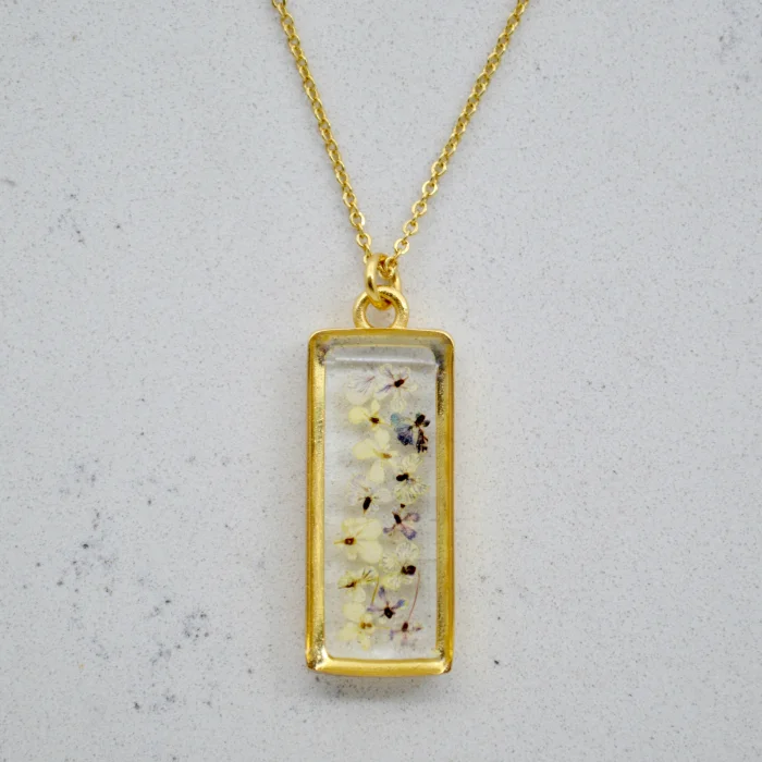 Each piece is filled with particles of Queen Anne's Lace flower, which are collected one by one by hand and then carefully plucked from the stem and pressed and dried.After the drying stage, these particles are carefully placed in handmade gold-plated frames and brought together with jewelry-grade crystal resin.