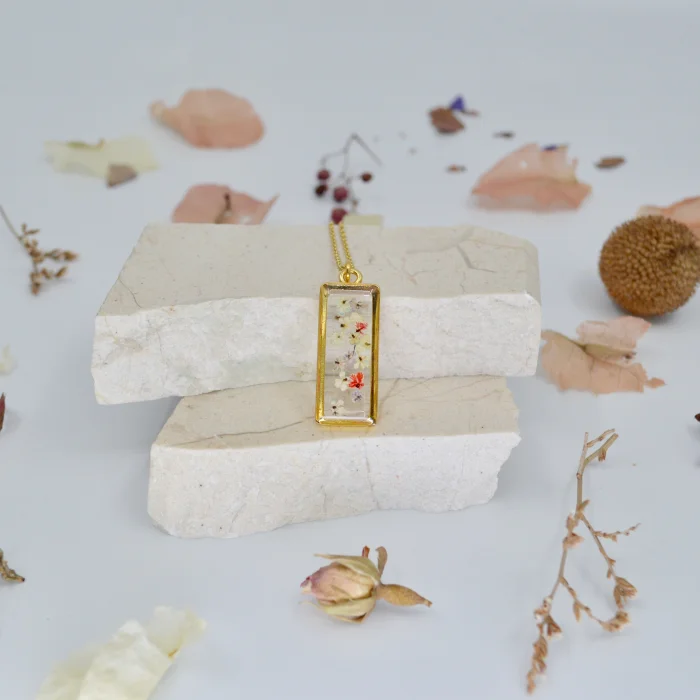 The way the tiny flowers are arranged is unique and no part will be the same as the other, the product will be exclusive only to its owner.The metal parts of the product and the chain are 14 karat gold plated.