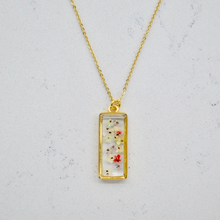 Each piece is filled with particles of Queen Anne's Lace flower, which are collected one by one by hand and then carefully plucked from the stem and pressed and dried.After the drying stage, these particles are carefully placed in handmade gold-plated frames and brought together with jewelry-grade crystal resin.