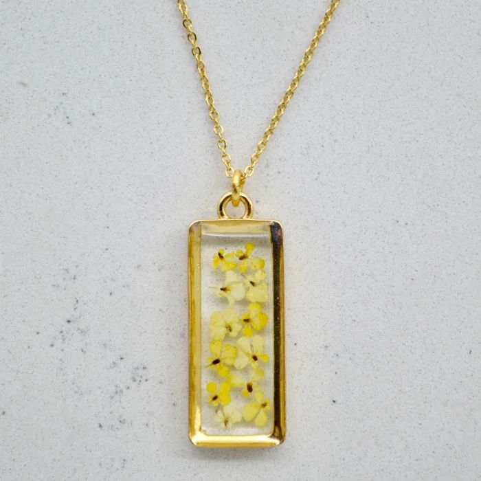 Each piece is filled with particles of Queen Anne's Lace flower, which are collected one by one by hand and then carefully plucked from the stem and pressed and dried.After the drying stage, these particles are carefully placed in handmade gold-plated frames and brought together with jewelry-grade crystal resin.