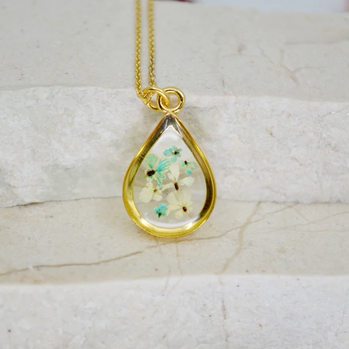 Each piece is filled with particles of Queen Anne's Lace flower, which are collected one by one by hand and then carefully plucked from the stem and pressed and dried.After the drying stage, these particles are carefully placed in handmade gold-plated frames and brought together with jewelry-grade crystal resin.