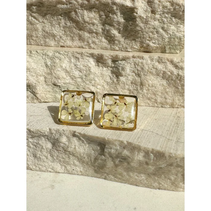 Each piece is filled with particles of Queen Anne's Lace flower, which are collected one by one by hand and then carefully plucked from the stem and pressed and dried.After the drying stage, these particles are carefully placed in handmade gold-plated frames and brought together with jewelry-grade crystal resin.