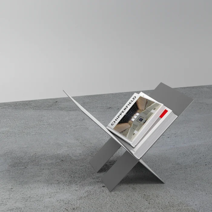 Two aluminum sheets interlock to stand upright. This design embraces raw material, challenging traditional assembly methods.