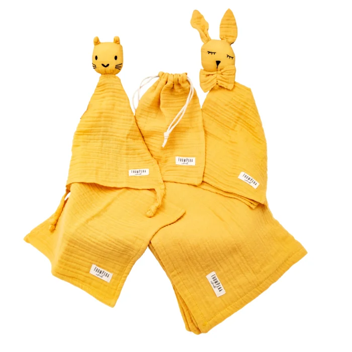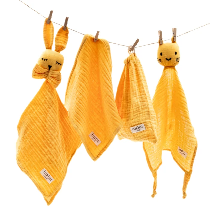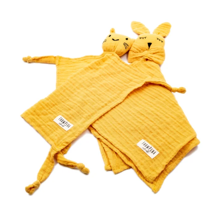 The FromPera Baby Muslin Set consists of a total of 5 pieces. The FromPera Muslin Blanket / Muslin Cover is designed in generous dimensions of 100x100cm and made with a four-layer muslin structure, making it an essential item that can be used as a blanket, swaddle, stroller cover, after-bath drying cloth, or play mat. The FromPera Muslin Cloth is a square muslin cloth measuring 25x25 cm, designed for use as a bib, shoulder cloth, sweat cloth, or handkerchief. The FromPera Muslin Sleep Buddy - Muslin Security Friend includes two adorable muslin sleep buddies, designed in the shapes of a cute rabbit and a sweet cat, each measuring 40x40 cm. Babies may feel anxious when their parents are not around, so they find comfort by bonding with their chosen objects. These charming FromPera Muslin toys will become babies' closest friends, making parents' lives easier as well. The FromPera Muslin Drawstring Mini Bag - Muslin Pouch is a lightweight and space-saving cotton muslin bag, measuring 24x16 cm. It can be washed and used in many different ways. You can place the muslin sleep buddies in this pouch after playtime or pack the muslin blanket when heading out. It can also hold essential items for your baby (such as pacifiers, bottles, teething toys, diapers, etc.) for easy access while you’re out. As mentioned, the FromPera Baby Muslin Set has been thoughtfully designed in a minimalistic way in four different colors to cater to the needs of both babies and parents.