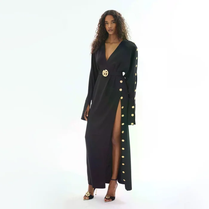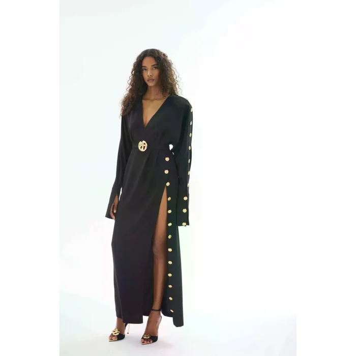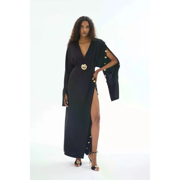 The Black Button-Down Dress is a special piece of Gaia n Uranos that combines elegance and elegance. This dress offers an option that modern women can easily choose in their daily life and at special events. Button details strengthen the aesthetic appearance of the dress while also providing practical use.
