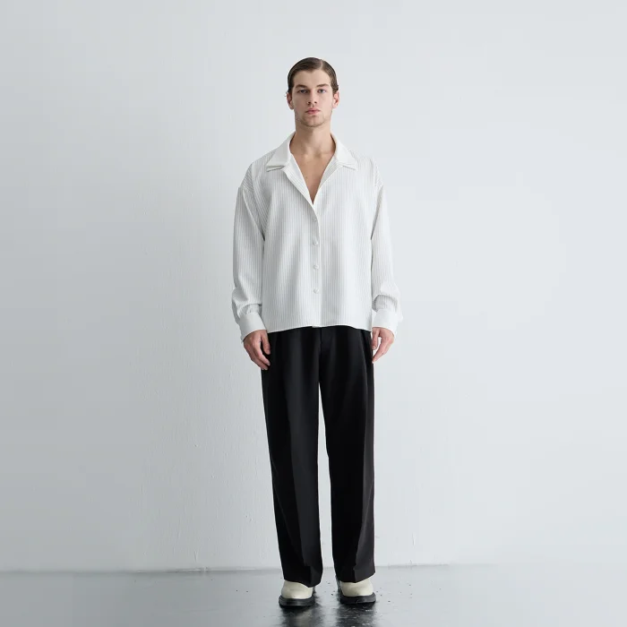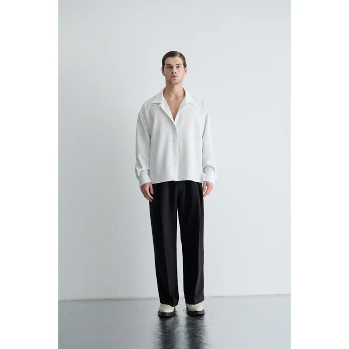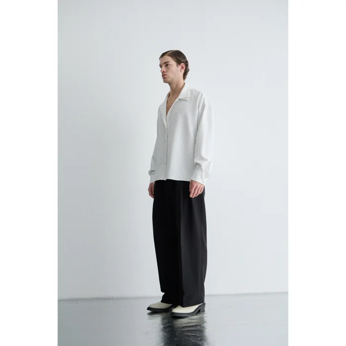 It brings a modern interpretation to classic tailoring with its high waist form and elegant pleats at the front. With its fluid silhouette, it offers a relaxed yet powerful stance.