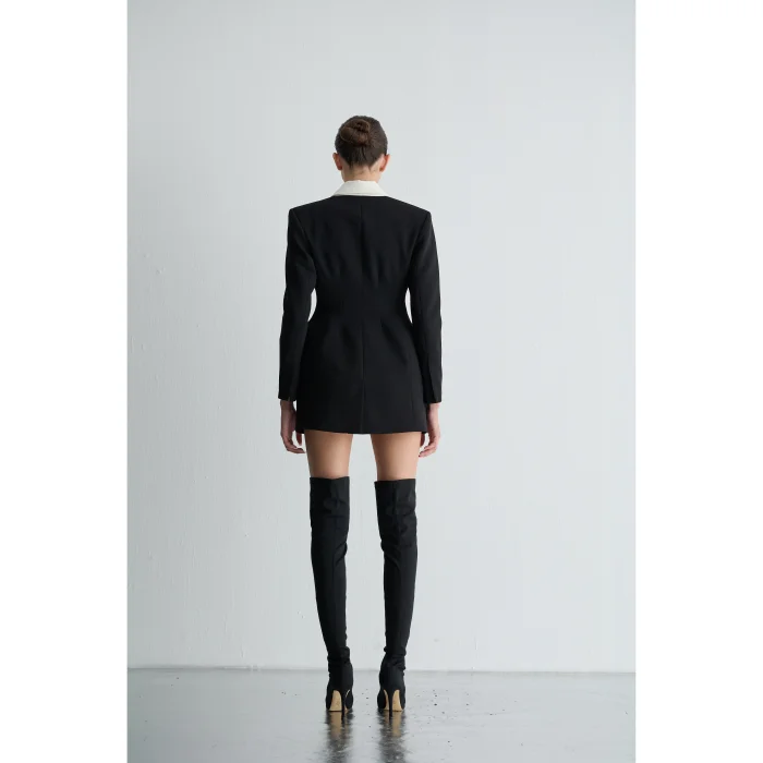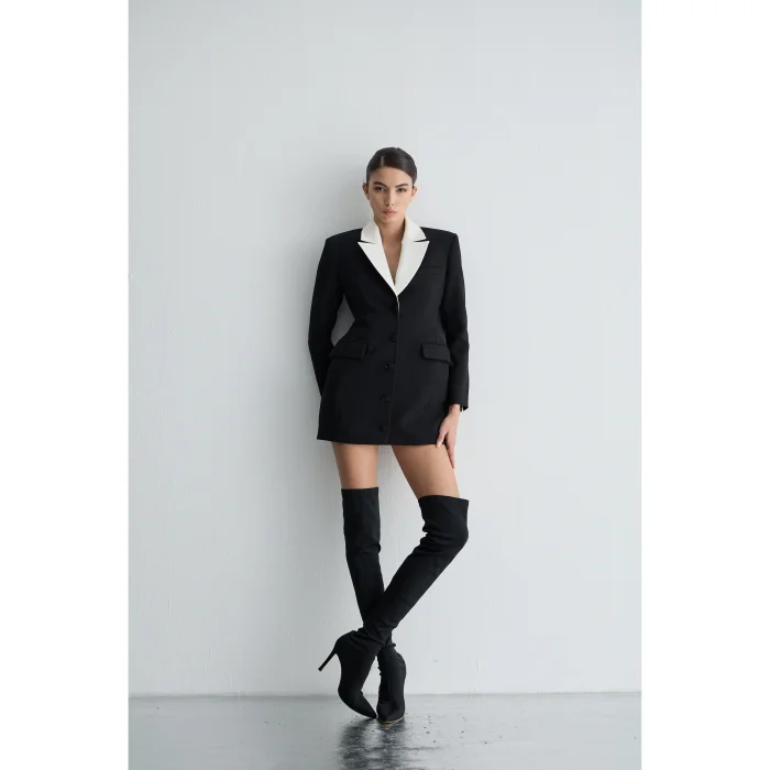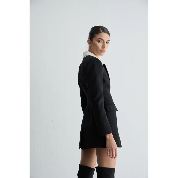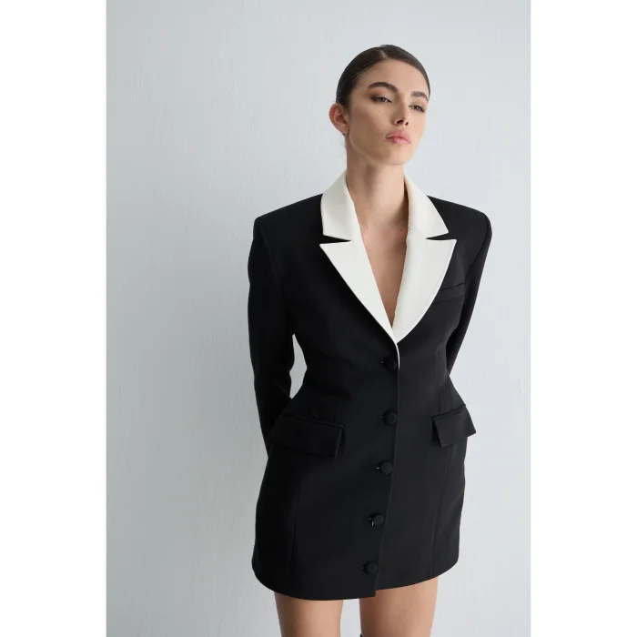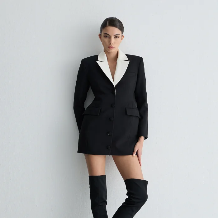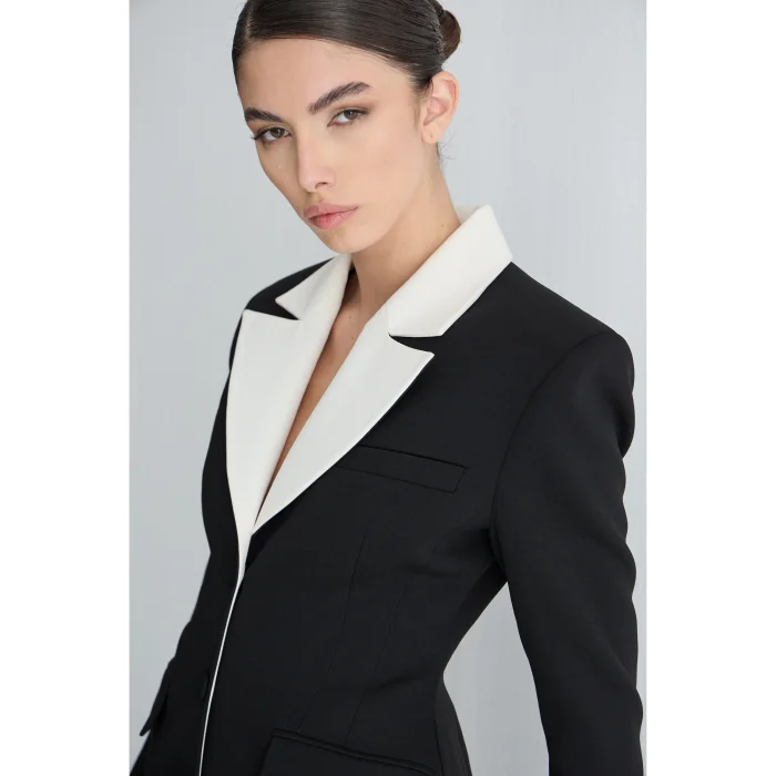 While it elegantly follows the body form with its stitching details, the strong silhouette of the jacket structure creates a modern elegance.
