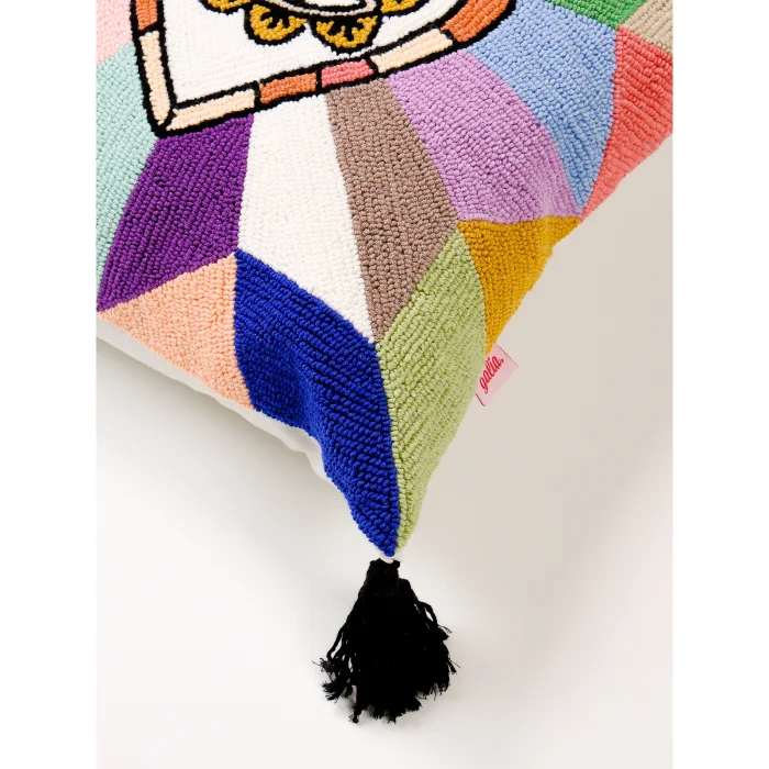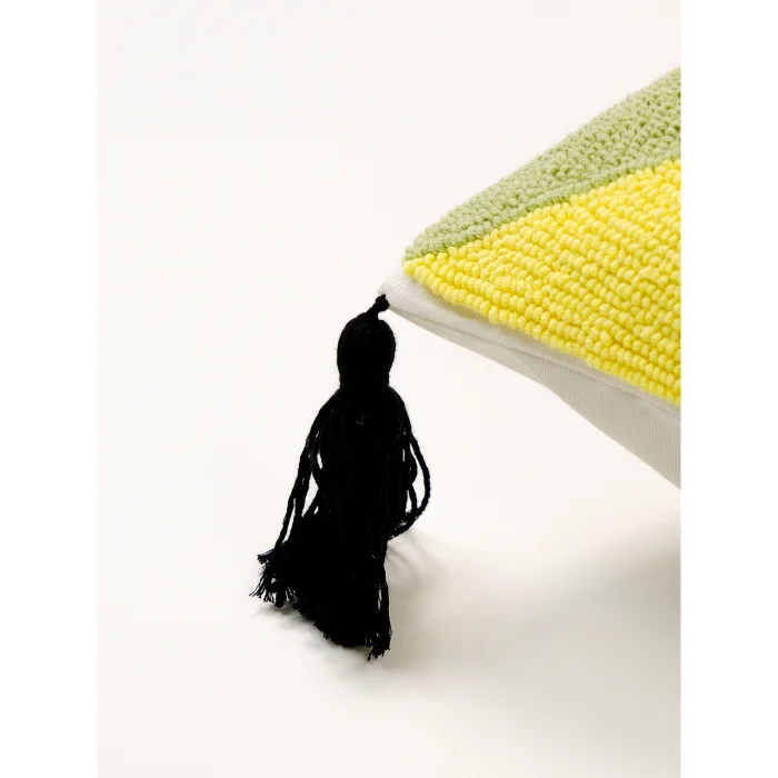 Black tassels at the corners offer movement and textural richness.