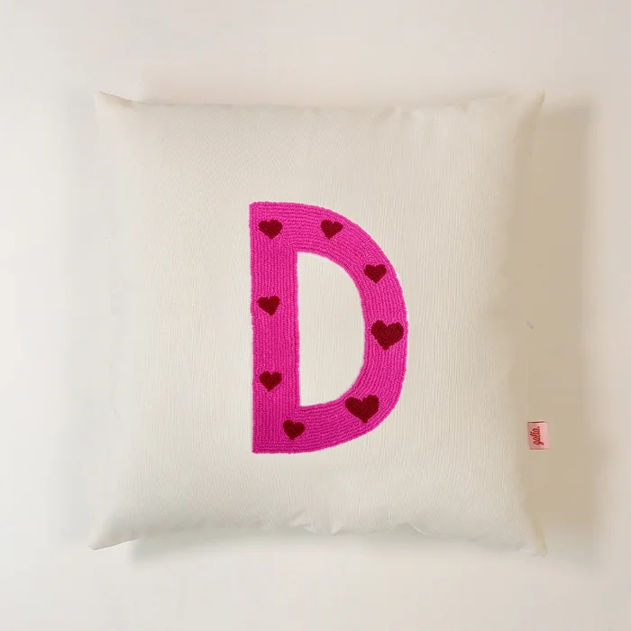The letterform, processed with the punch (tuft) technique, creates an embossed and soft texture on the surface, giving the product both tactile and visual richness. The fuchsia and red tones contrasting with the off-white background provide a striking yet balanced accent in the decoration.