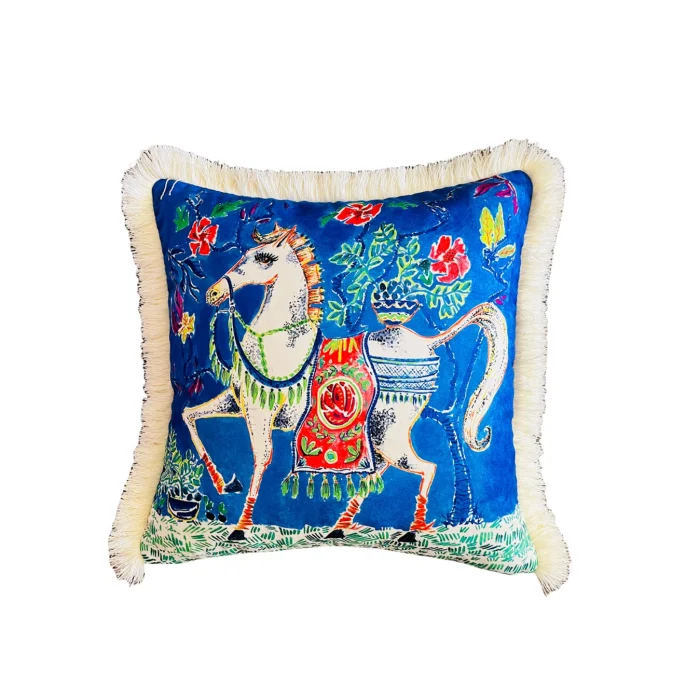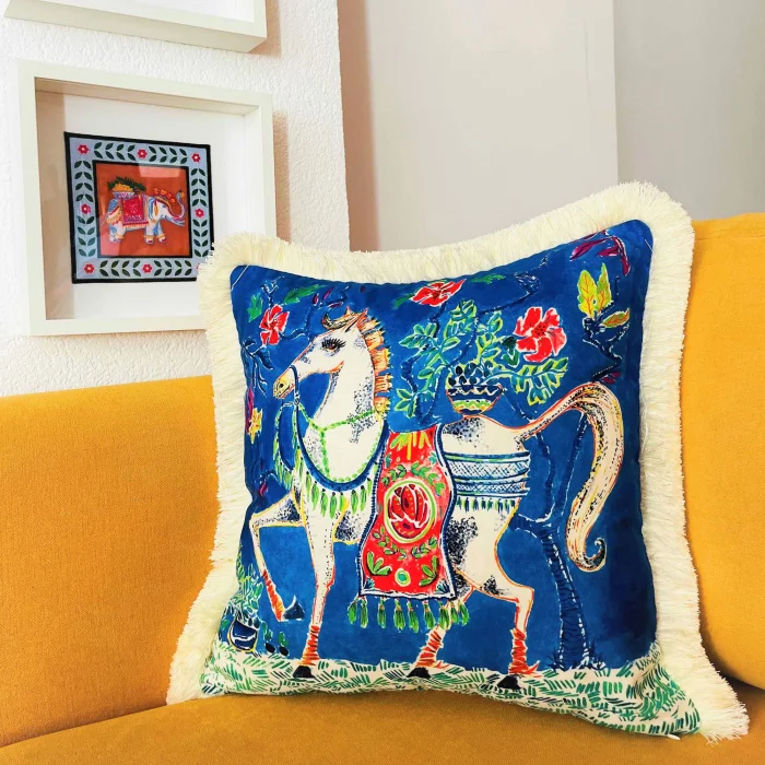 - Decorative White Horse Patterned Blue Velvet Throw Pillow Cover (45 x 45) Model and Design are reserved by GE Living. Double Sided Pillow - The back of our covers can be used as a solid colorKren TasselThis product contains pillowcases only. Pillow inside not includedOur pillowcases come in gift wrapping