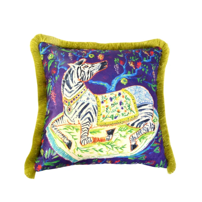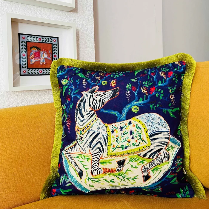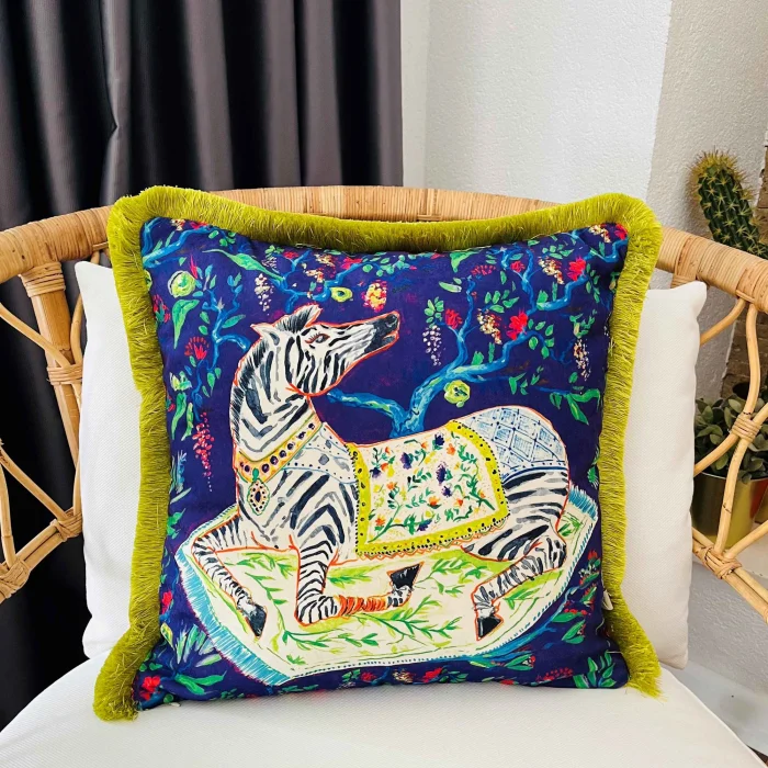 - Decorative Sitting Zebra Patterned Navy Blue Velvet Throw Pillow Cover (45 x 45) Model and Design are reserved by GE Living. Double Sided Pillow - The back of our covers can be used in solid colorMustard TasselThis product contains pillowcases only. Pillow inside not includedOur pillowcases come in gift wrapping