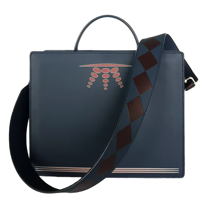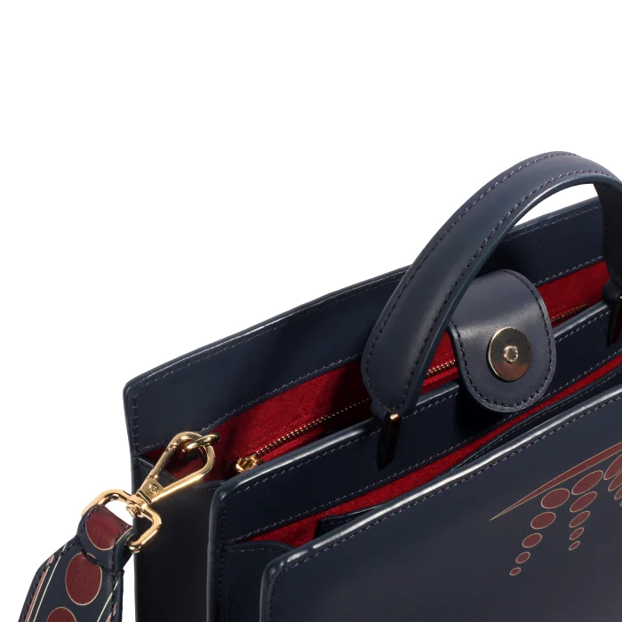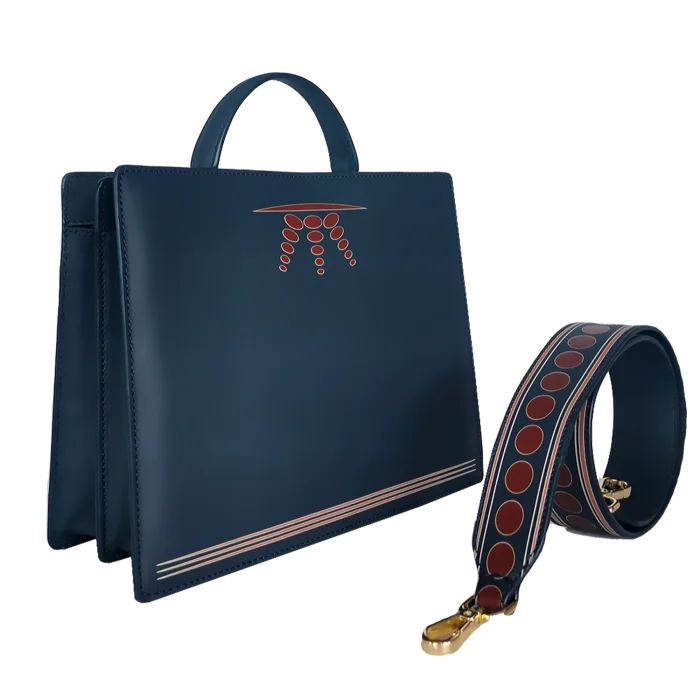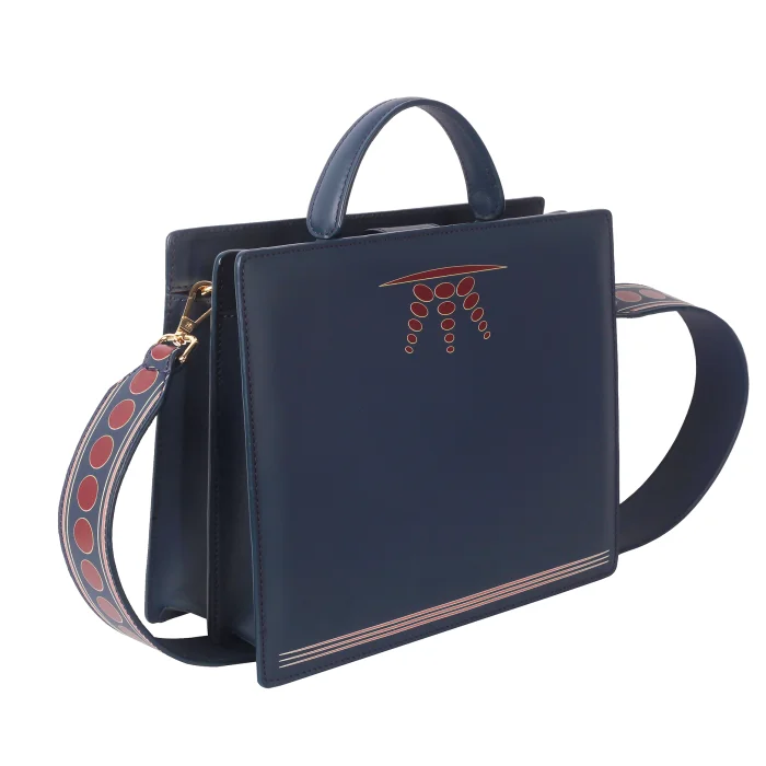 Ray Bag – Navy Blue & Red Dots Pattern 100% Premium Quality Soft Calfskin Leather. Gold Bag Accessories. Detachable Shoulder Strap. Red Alcantara Lining. Bag Dimensions: Length: 22 cm – Width: 26 cm – Depth: 10 cm Shoulder Strap Length: 87 cm – Strap Width: 5 cm