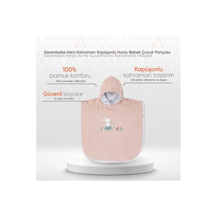 Product DescriptionGezenbebe Hero Hero Hooded Towel Baby Kids Poncho: It's Time to Dry Off with Heroes! Gezenbebe Hero Hero Hooded Towel Baby Kids Poncho is specially designed for your little heroes. This poncho in pastel shades will wrap your baby around and give you a soft hugging feeling. It offers a warm embrace after bathing with the detailed embroidery of Gezenbebe's cute heroes, Elephant, Rabbit, Teddy Bear and Koala, on its hood. Its piping, embellished with the iconic Gezenbebe pattern, makes this poncho not only a functional but also a stylish accessory. With its 100% cotton structure, it does not irritate the skin, absorbs water quickly and shortens the drying time. It's an ideal option for families looking for post-bath comfort and style!" Prominent Features:ORIGINAL GEZENBEBE SIGNATURE: Put your baby's signature on your baby's style with Gezenbebe's unique heroes and iconic pattern. HIGH QUALITY FABRIC: Gezenbebe Hero Hero Hooded Terry BabyChildren's Poncho guarantees your baby's comfort with its breathability and ultra-softness. UNIQUE DESIGN: Its cute and unique protagonists soothe your baby's mood while also adding originality to it. MULTIFUNCTIONAL USE: Not only ideal for daily use, but also for beach and after-pool. SPECIAL FOR SENSITIVE SKIN: With its hypoallergenic properties and easy washability, it is suitable for all skin types, especially ideal for babies with sensitive skin. IDEAL AS A GIFT: With its colorful, cute and unisex design, it is the perfect gift option for all babies. NATURAL DYE: Natural and harmless water-based dyes are preferred in prints. ALWAYS THE BEST FOR YOU: Customer satisfaction is at the forefront for us. With your feedback, we are constantly improving our products and striving for excellence. Technical Details:High Quality Material: Made with premium materials that are lightweight, breathable and quick-drying. Baby Friendly: With its 100% cottony texture, it provides maximum comfort and dryness for your baby's sensitive skin. Usage Time: Our ponchos will be a companion that will not leave your baby's side until the age of 5. Unique Color Options: With attractive color and pattern alternatives such as Bunny, Elephant, Koala and Teddy. Care Instructions: Wash at 30 degrees and dry without exposing to direct sunlight. Gezenbebe Hero Hero Hooded Towel Baby Kids Poncho both reflect your style and maximize your baby's comfort. His smile is the most valuable return for us.