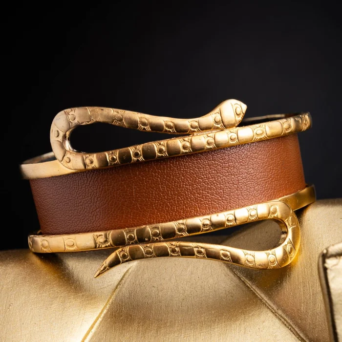 Giwa Serpent Embrace Clamp A symbol of power, grace and transformation! Giwa Serpent Embrace offers a bold and sophisticated style with the figure of a mystical serpent. Double-sided interchangeable leather strap. An iconic design that will attract attention both in everyday and special moments. -Chlorine can cause wear and tear in perfumes and chemical products. -Original designs with GIWA stamp. -Handcrafted in Istanbul.