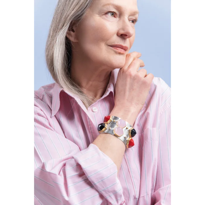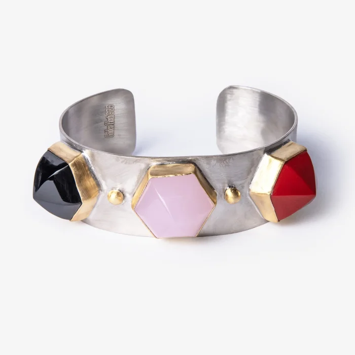 Crafted from 925 sterling silver, this cuff features three luminous moonstones nestled in dome-like settings inspired by the architectural beauty of the hammam dome. These domes represent containment and sanctuary space where one can pause, reflect, and embrace new beginnings. Let the Triple Pink Quartz Dome Silver Cuff Bracelet remind you of your journey toward renewal and self-discovery.