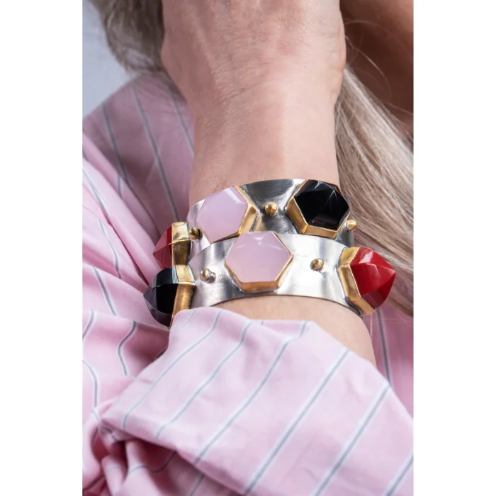 Product: Triple Pink Quartz Dome Silver Cuff Bracelet