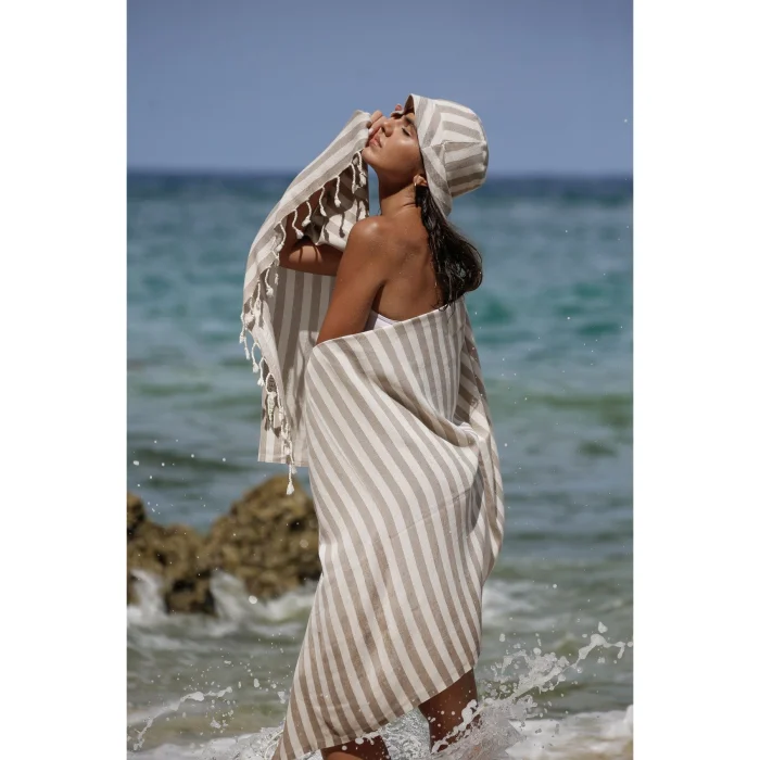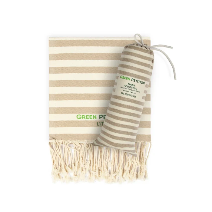 Environmentally friendly: 10 plastic bottles used for each peshtemal were turned into polyester threads. Sustainable: For each loincloth, 5 waste t-shirt fabrics were recycled into improved cotton yarns. Dye-free and Chemical-free: There was no use of dyes or chemicals at any stage of production. We obtained the dyed fabrics of the original materials of your peshtemal. Sea Friendly: We saved 5000 liters (1320.9 gal) of clean water for each loincloth. FEATURES Light and Portable: Don't worry about portability. Thanks to its 190 gram weight and light structure, it takes up minimum space in your beach bag or special carrying case. Ideal Size: Your 90x170 cm loincloth makes your beach experience more comfortable with its large size. Multi-Purpose Carrying Bag: You don't just buy a loincloth, you can use the practical bag of your loincloth for your beach accessory. Recycled and Reusable Package: You can reuse the special bags that are recycled and have dimensions of 34 x 14 cm. Wherever you can take your peshtemal while traveling in a special, sustainable bag, you can't easily keep it down.