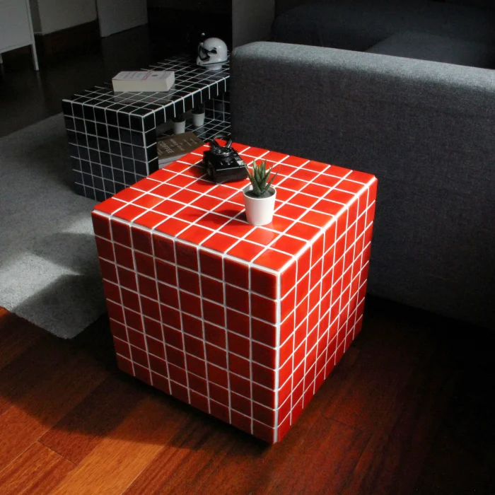 Size: 40X40X40h Weight: 27 kg Coating: Ceramic, glass mosaic or natural stone Internal skeleton: Wood Uses: Indoors only Delivery: 21 working days Made to order Since it is a handmade product, minor errors may appear