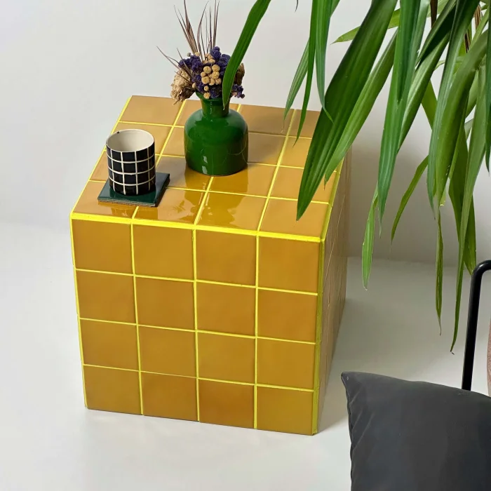 Size: 40X40X40h Weight: 27 kg Coating: Ceramic, glass mosaic or natural stone Internal skeleton: Wood Uses: Indoors only Delivery: 21 working days Made to order Since it is a handmade product, minor errors may appear