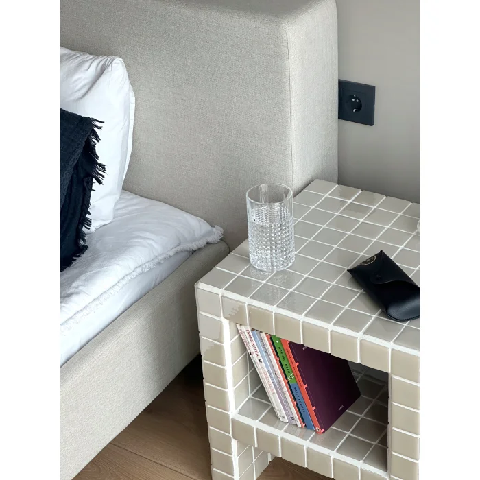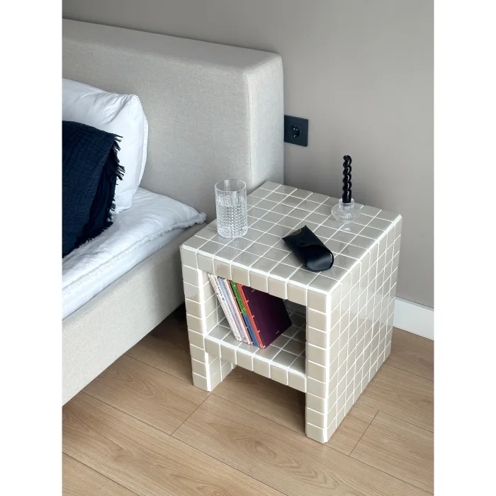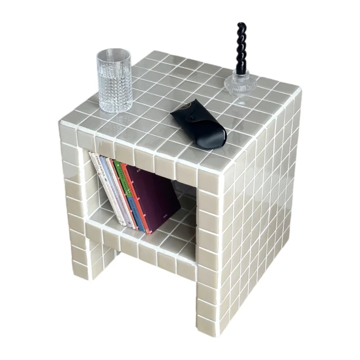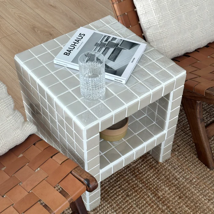 Size: 42X42X48h Weight: 32 kg Coating: Ceramic, glass mosaic or natural stone Internal skeleton: Wood Uses: Indoors only Delivery: 21 working days Made to order Since it is a handmade product, minor errors may appear