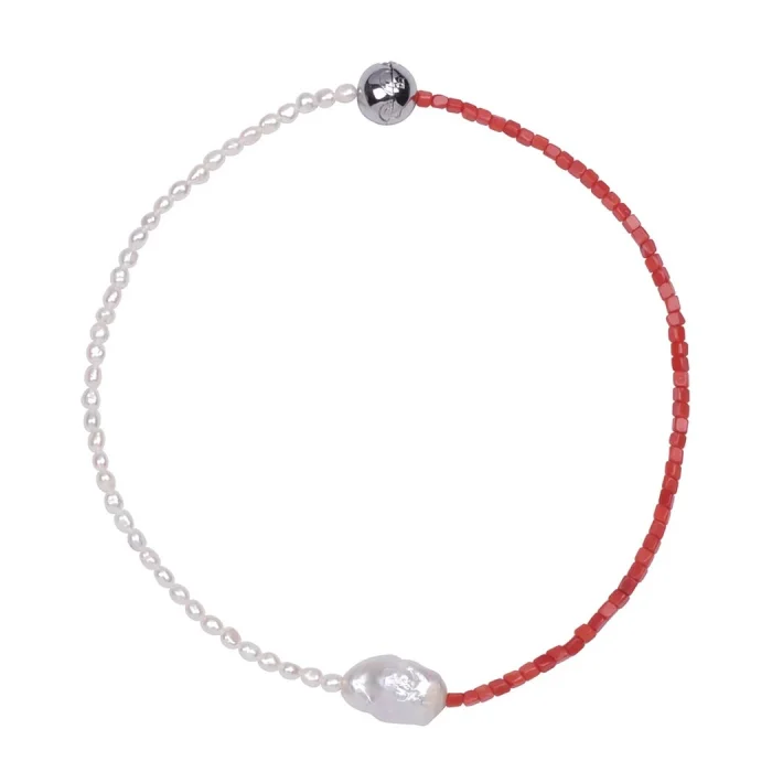 Half of My Heart necklace with baroque pearl and coral details, 22K gold plated on bronze; It adds an elegant touch to your style in your most special moments.