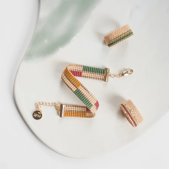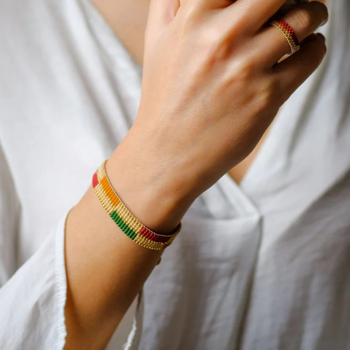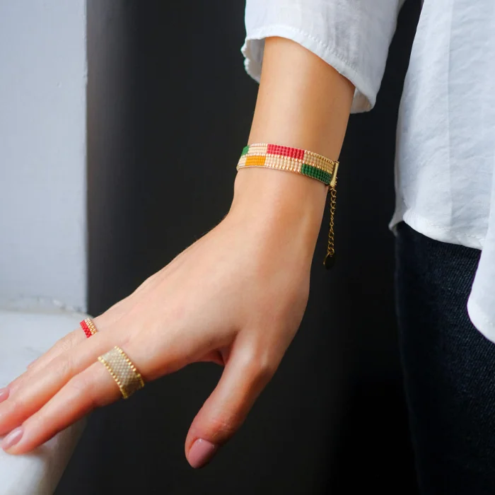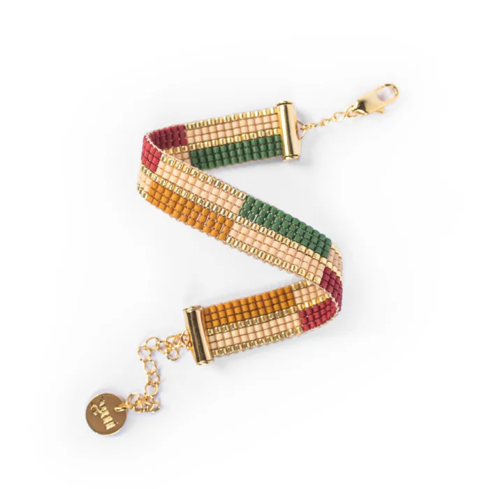 All bracelets are handsewn by using glass beads. The metal parts of the bracelet are made of brass plated with 18 karat gold. The bracelets adapt to different wrist thicknesses with the end chain.