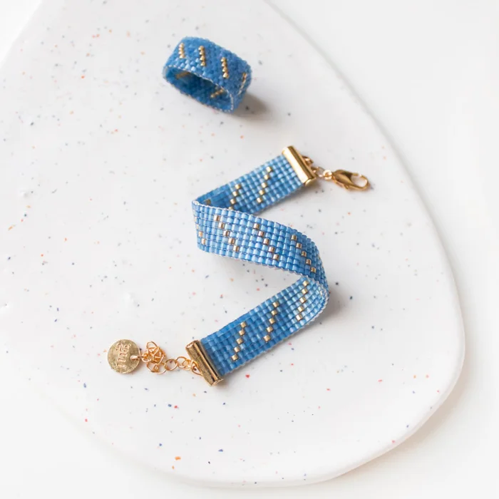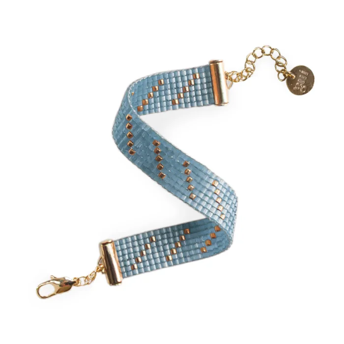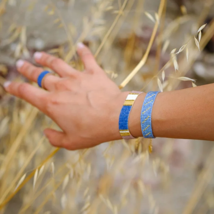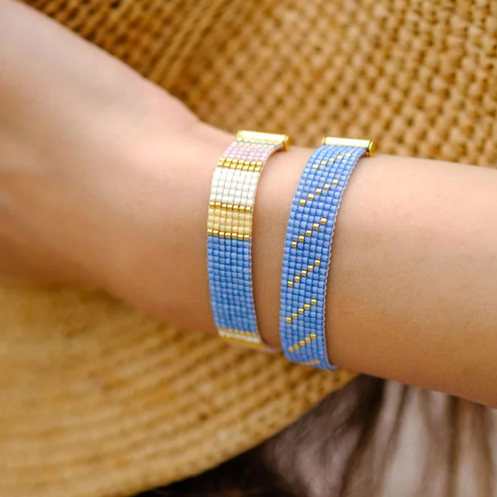 All bracelets are handsewn by using glass beads. The metal parts of the bracelet are made of brass plated with 18 karat gold. The bracelets adapt to different wrist thicknesses with the end chain.