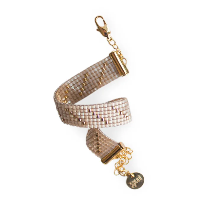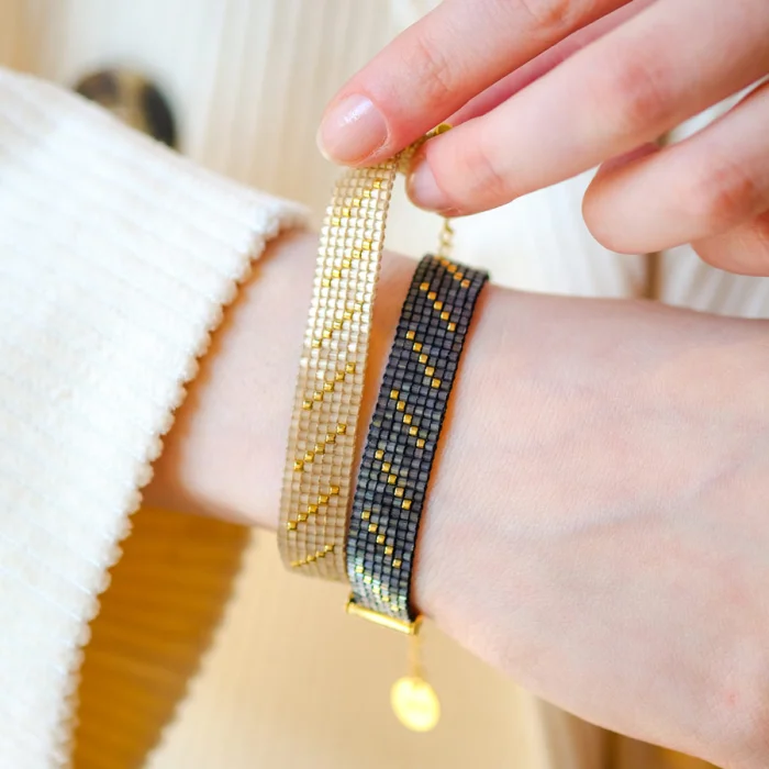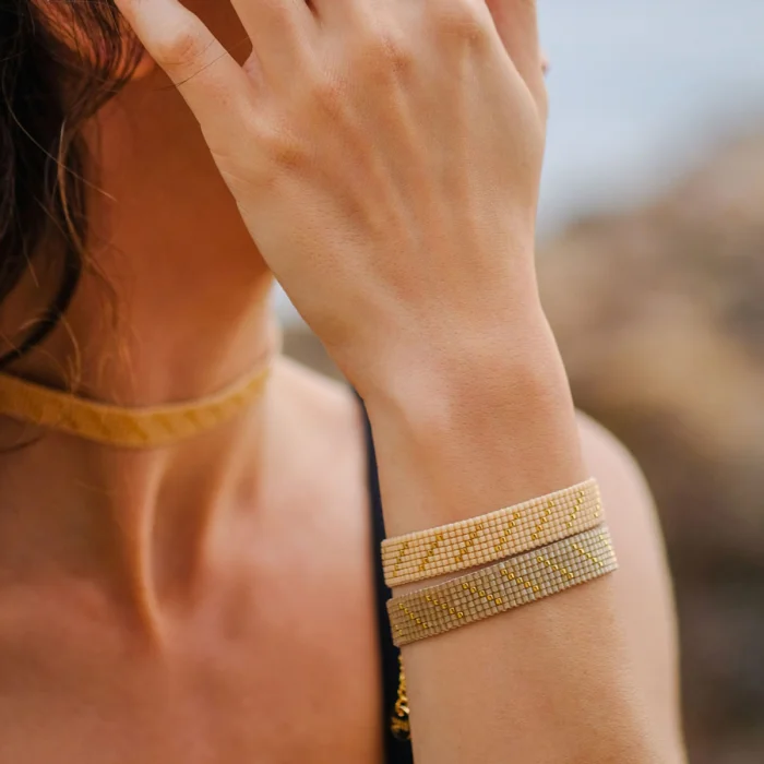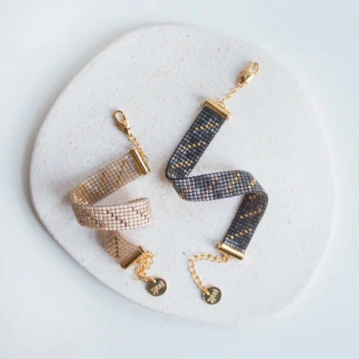 All bracelets are handsewn by using glass beads. The metal parts of the bracelet are made of brass plated with 18 karat gold. The bracelets adapt to different wrist thicknesses with the end chain.