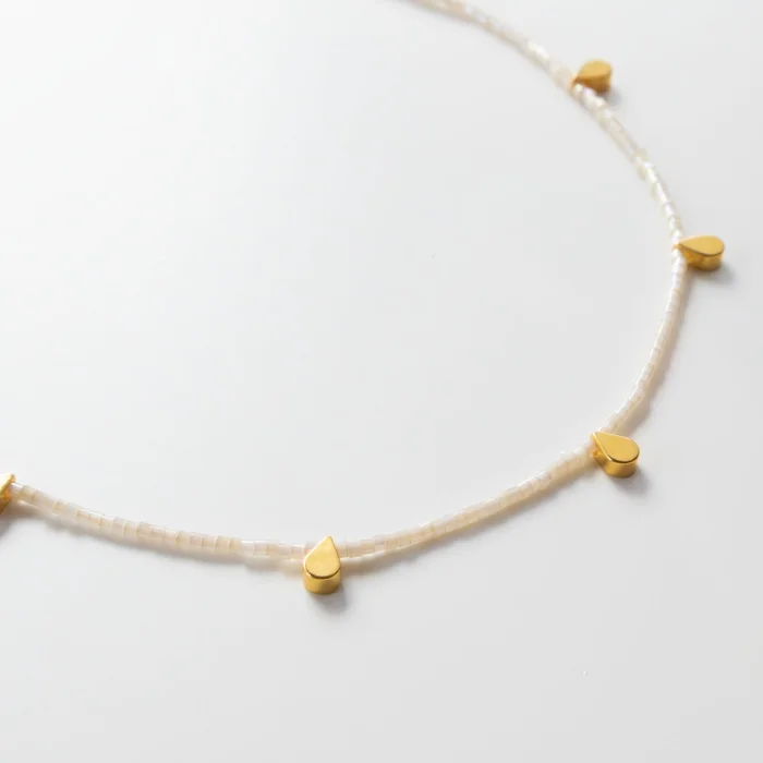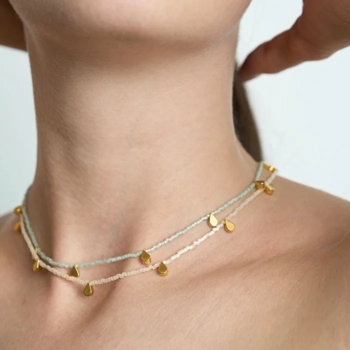 Ivy necklaces feature 18-karat gold-plated brass cast beads and glass-cut beads. Its adjustable chain is 18 carat micron gold plated on 925 sterling silver. Necklace length: min.38 – max.41.5 cm