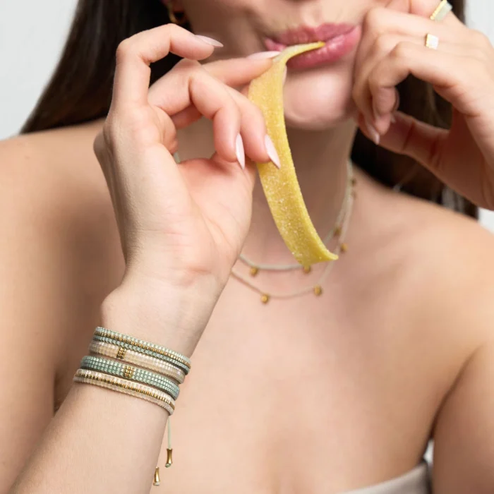 Line bracelets are produced by hand sewn with glass beads. Thanks to its adjustable strap, it adapts to different wrist thicknesses.