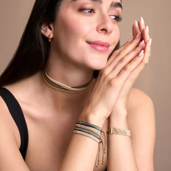 Line bracelets are produced by hand sewn with glass beads. Thanks to its adjustable strap, it adapts to different wrist thicknesses.