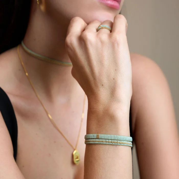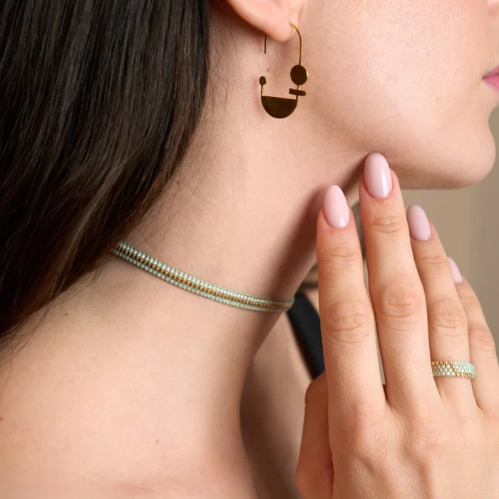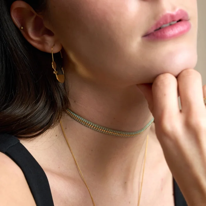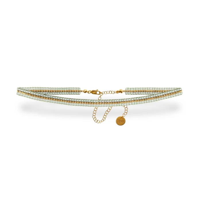 Line chokers are produced by hand sewing with glass beads. Its adjustable chain is 18 carat micron gold plated on 925 sterling silver. Choker width: min.29 – max.39 cm