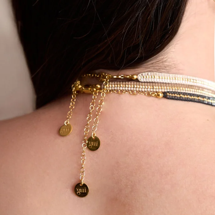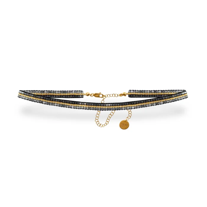Line chokers are produced by hand sewing with glass beads. Its adjustable chain is 18 carat micron gold plated on 925 sterling silver. Choker width: min.29 – max.39 cm