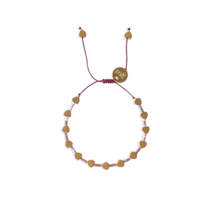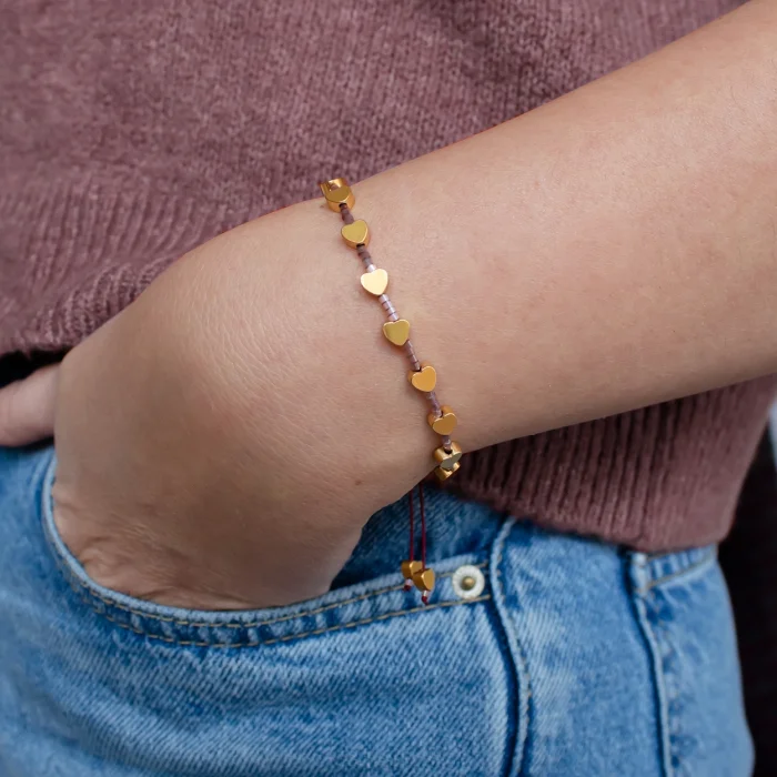 Love bracelet is produced with circular shaped 18 carat gold plated brass beads. There are damson colored glass beads between the brass beads.