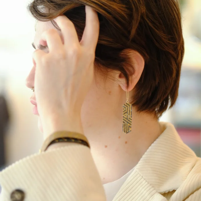 Earringss are produced by sewing glass beads. Metal parts are 925 sterling silver plated with 14 karat gold.